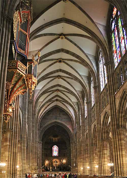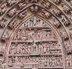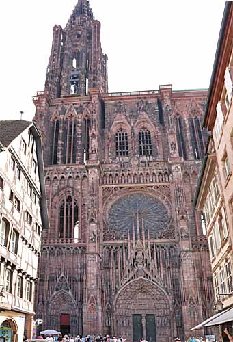 La Cathédrale gothique Notre-Dame de Strasbourg, dont les travaux s'échelonnèrent de 1150 à 1439 fut, jusqu'au XIXe siècle, l'édifice le plus élevé de la chrétienté. Elle est reconnaissable par son unique clocher surmonté d'une flèche. Sa dentelle de pierre, sa statuaire, ses vitraux sont autant d'éléments qui ont amené Victor Hugo à la qualifier de " prodige du gigantesque et du délicat ".
