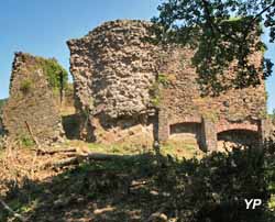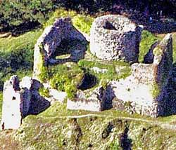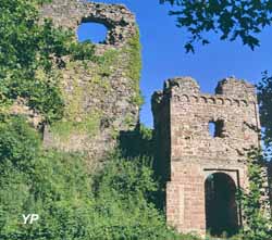 ![]() Le Hugstein entouré de son fossé (doc. FM - Pro Hugstein) | ![]() La ruine du château abbatial murbachois du Hugstein (XIIIe siècle), avec les vestiges de sa tour-porte Renaissance du XVe siècle (doc. JMN - Pro Hugstein) |
