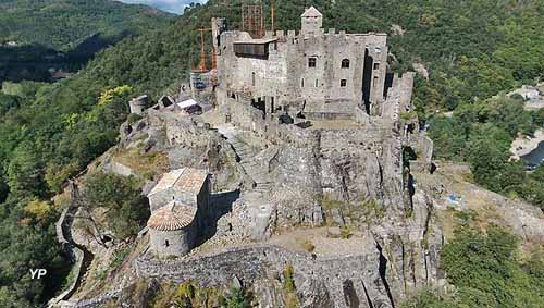 Le château de Ventadour se dresse sur le Rocher Rolandy, au-dessus du confluent des rivières Ardèche et Fontaulière, sur la commune de Meyras.