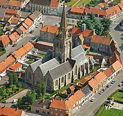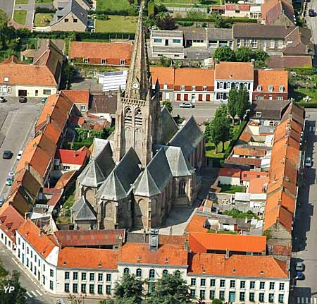 Les premiers offices religieux y ont été célébrés en 1208 par Bauduin Samuel, moine de l'abbaye de Bergues. Depuis sa construction, l'église n'a pas été épargnée par les événements. Elle est incendiée en 1566, suite aux troubles religieux liés à la "Révolte des Gueux" (1566-1567). Un premier tremblement de terre l'a détruite, le 5 avril 1580, et seule la tour subsista. De 1587 à 1630, les travaux de restauration du choeur, des chapelles latérales et des trois nefs de style gothique se succèdent et lui donne sa configuration actuelle d'église-halle(hallekerque). Un deuxième tremblement de terre, le 18 septembre 1692, nécessite la reconstruction de la flèche octogonale. Terminée en 1694, elle culmine à 63m et est assise sur une puissante tour carrée centrale dont les piliers font 4,50 m de côté et qui est probablement la partie la plus ancienne (12e siècle).