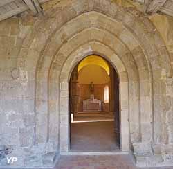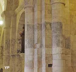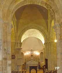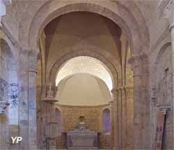 Choeur avec voûte en " cul de four ", arcs de plein cintre. Plusieurs litres funéraires se superposent. Les chapiteaux sont de toute beauté.