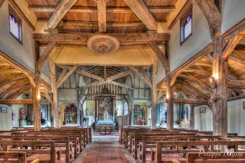 Eglise XVIe-XVIIe s. en pan de bois, à plan en croix latine
