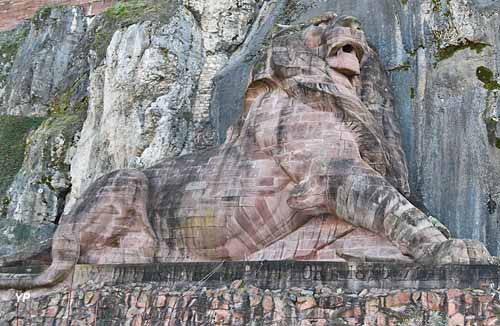 Scultpture élevée par Auguste Bartholdi à la mémoire des victimes du siège de 1870/1871. Le lion gigantesque achevé en 1880 mesure 20m de long sur 11m de haut.