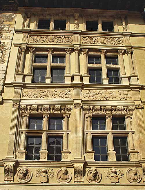 Cette façade Renaissance, d'une richesse exceptionnelle, est un placage sur une maison médiévale comportant plusieurs corps de logis.