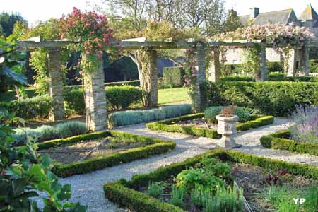 Le jardin est organisé selon le principe des chambres de verdure. Les différences de niveau sont soulignées par des murets en pierres sèches. Le jardin s'ouvre sur la campagne environnante avec au premier plan de vastes étangs et en fond une colline boisée. Des collections de rosiers, d'hydrangeas et de plantes vivaces ornent les parterres. La pergola constituée de 12 piliers en pierres supporte les rosiers grimpants et s'ouvre sur le bassin d'ornement. Des bancs disséminés dans le jardin incitent à profiter de la sérénité du lieu. Le manoir est un élément du jardin qui lui apporte en retour charme et douceur.